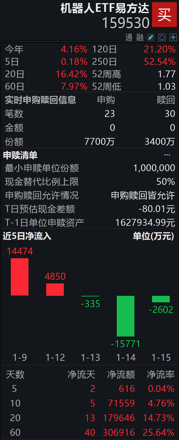 在资金流向方面,机器人ETF易方达(159530)作为跟踪国证机器人产业指数的基金产品,近期吸引了大量资金流入。近10日内,该基金“吸金”超过7.1亿元,近20日更是达到17亿元以上。目前,该基金的规模已攀升至160.86亿元,成为跟踪国证机器人指数的ETF中,唯一规模突破百亿元的产品。截至发稿时,机器人ETF易方达在盘中又获得了4300万份的净申购。