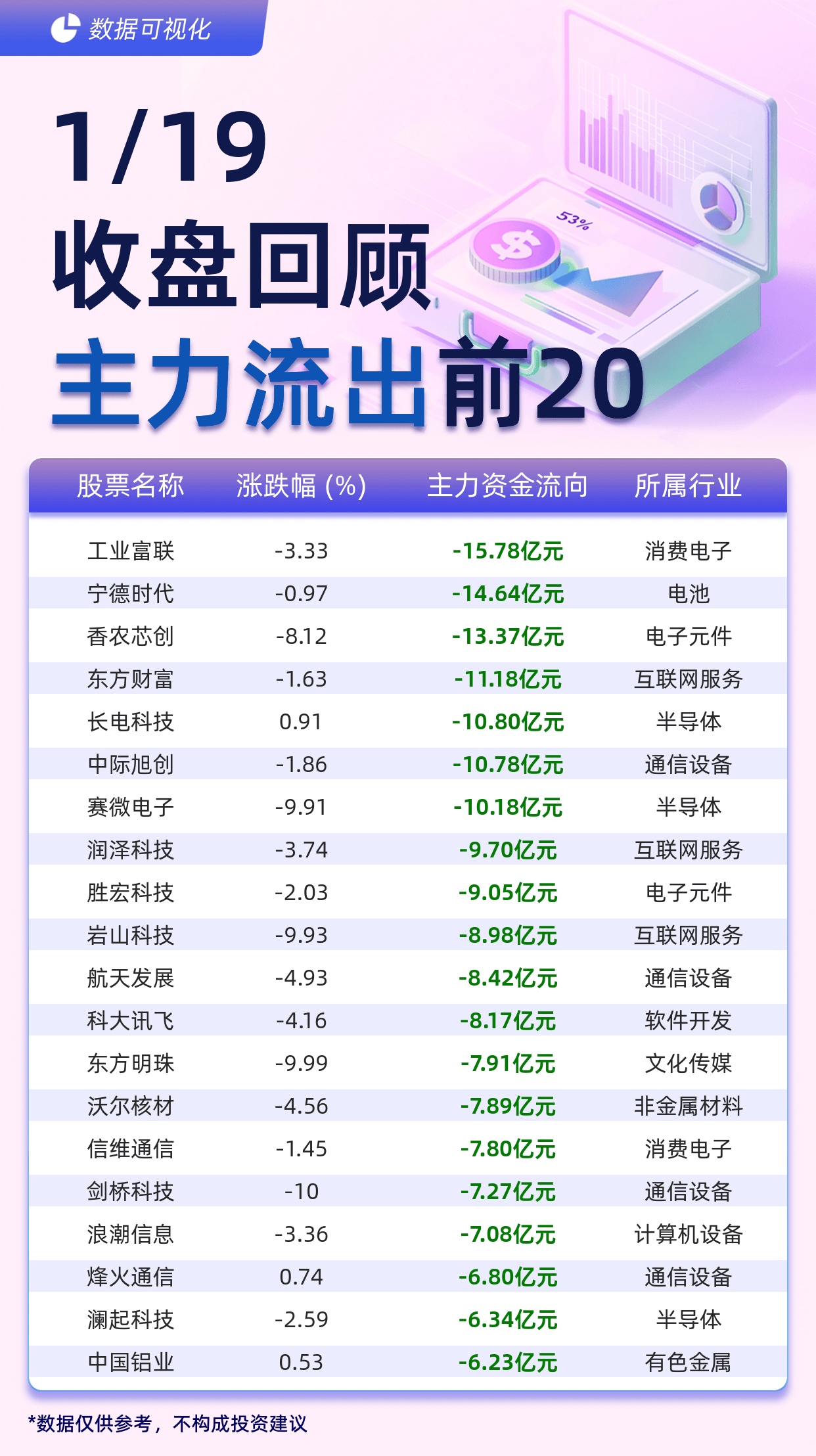 根据交易所最新披露的资金流向数据,1月19日A股市场主力资金净流出规模显著扩大,工业富联、宁德时代等20只个股成为资金撤离的“重灾区”。其中,电子制造龙头工业富联以15.78亿元的单日净流出额领跌全市场,新能源板块标杆宁德时代紧随其后,净流出金额达14.64亿元。