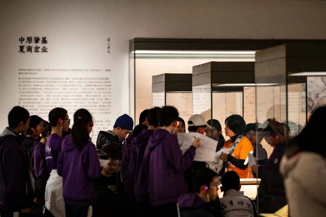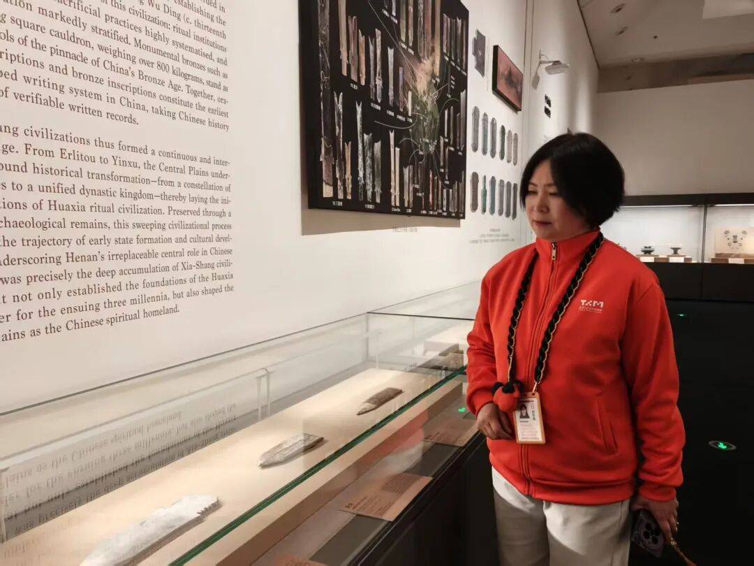 面对研学团队与散客叠加的情况,郭冬梅需要灵活应对。展厅入口处的贾湖遗址骨笛和龟甲展品前常出现多个团队同时讲解的现象,她会及时介入疏导,引导观众分批次参观。“有时需要协调讲解顺序,有时要建议观众先浏览其他展品,避免人员聚集影响体验。”她的细致工作确保了展厅秩序井然。