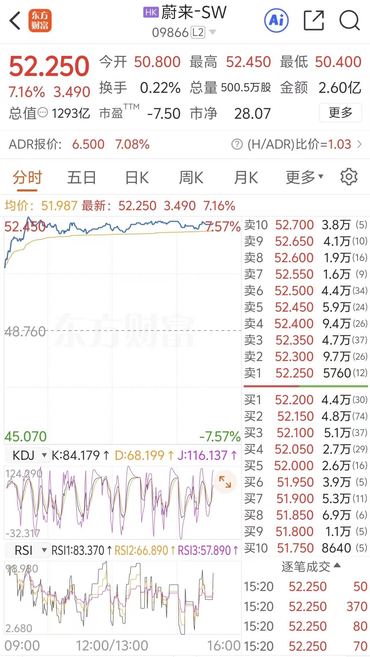 4月13日,港股市场上的蔚来-SW表现亮眼,盘中股价呈现震荡上扬态势,涨幅一度突破7.5%,最高触及52.45港元/股。截至15时20分,其股价依旧保持强劲涨势,上涨7.16%,报收于52.25港元/股。