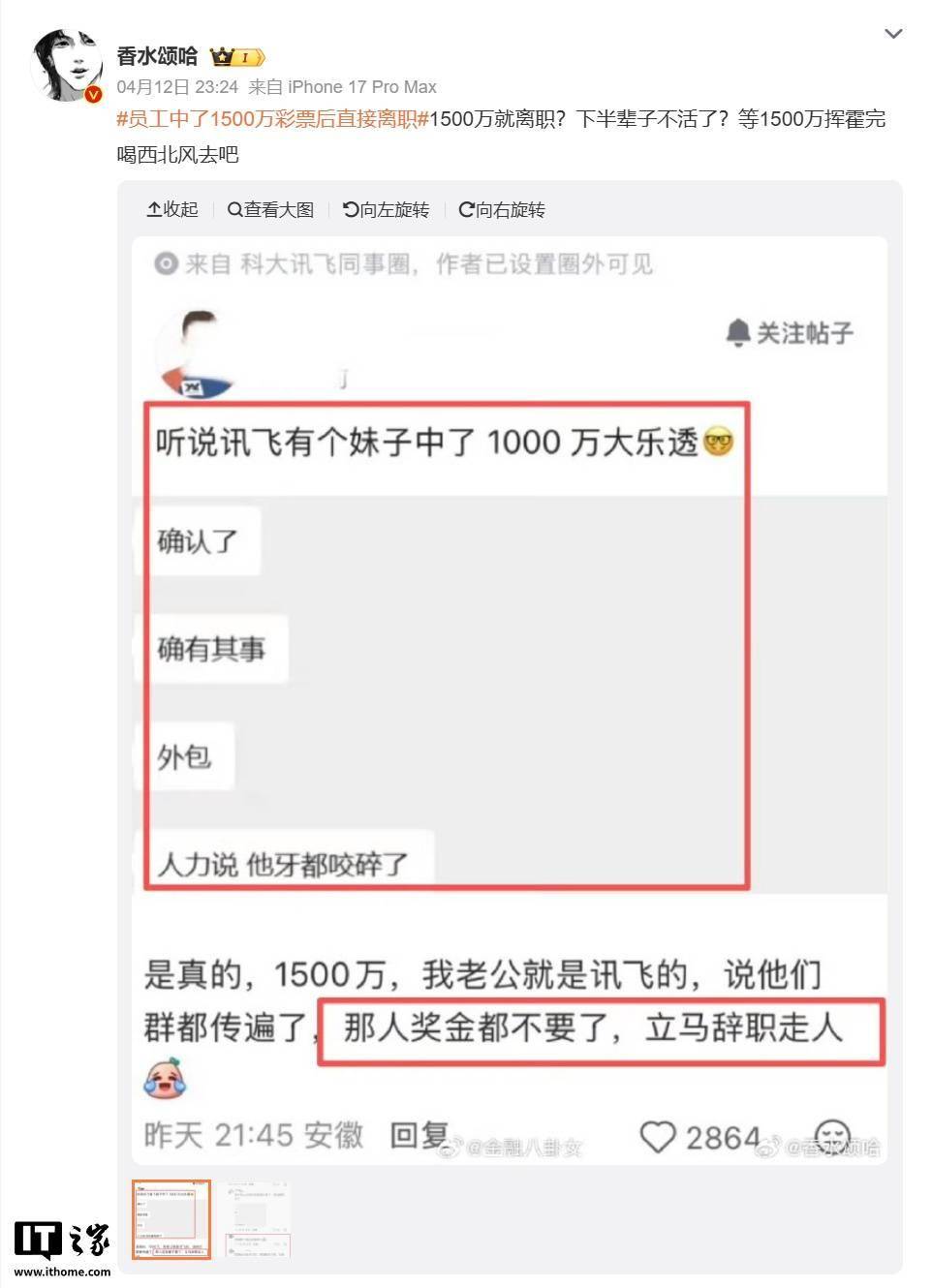 近日,一则关于“科大讯飞员工喜中巨额彩票”的传闻在网络上引发广泛关注。尽管中奖金额存在不同说法,但相关话题迅速登上微博热搜榜,截至目前阅读量已突破1.4亿次,成为网友热议的焦点。