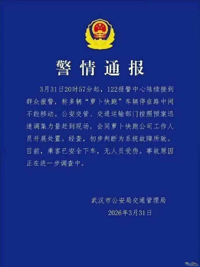 武汉市公安局交通管理局近日发布通报称,3月31日晚间,122报警中心陆续接到市民反映,多辆“萝卜快跑”自动驾驶车辆在行驶过程中突然停驻,导致部分路段交通受阻。接报后,公安交管部门联合交通运输局迅速启动应急预案,调派警力与技术人员赶赴现场,同时联系运营企业协同处置。