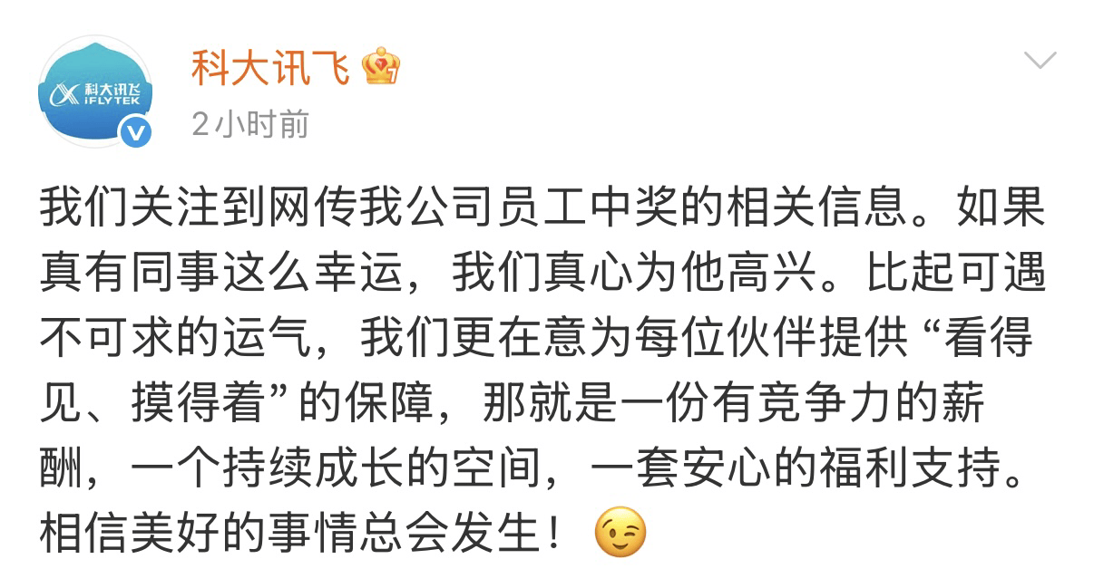 随着事件持续发酵,各种细节被不断添油加醋:中奖彩票类型从大乐透变成双色球,中奖者身份从正式员工演变为外包人员,甚至有传言称公司HR因员工“说走就走”气得咬牙切齿。面对愈演愈烈的猜测,科大讯飞官方微博于次日发布声明,既未承认也未否认中奖事实,仅表示“若真有同事如此幸运,我们真心为他高兴”,同时强调公司更注重为员工提供“有竞争力的薪酬、成长空间和福利保障”。这份回应被网友评价为“高情商招聘广告”,巧妙转移了舆论焦点。